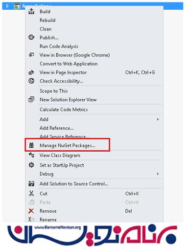 در مرحله بعدی می خواهیم MVC Grid را در پروژه خود نصب کنیم. برای نصب آن، روی Solution راست کلیک کرده و به Manage NuGet Packages بروید: