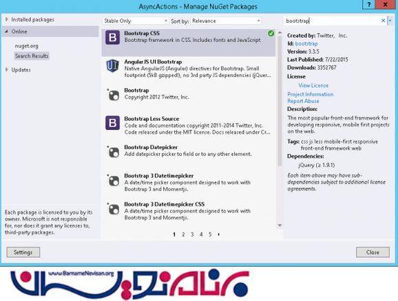 همانطور که قبلا گفتیم، MVC Grid برای طراحی، از bootstrap استفاده می کند. بنابراین مورد بعدی که به آن نیاز داریم نصب bootstrap در پروژه است. برای همین مجدد به NuGet packages رفته و bootstrap را جستجو کنید.