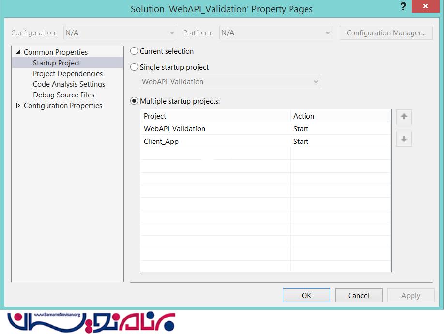روی پروژه راست کلیک نمایید و WebApi و Client_App را هر دو باید start بخورد و اجرا شود.