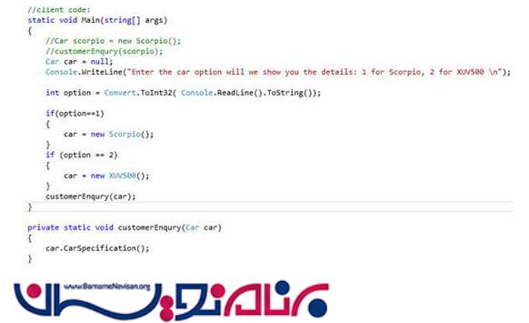این متد برای دریافت یک نمونه از ماشین درخواست شده از factory به کد مشتری نیاز دارد. برای این کار برخی تغییرات را در کلاس های abstract Car و کلاس پیاده سازی ایجاد می کنیم.