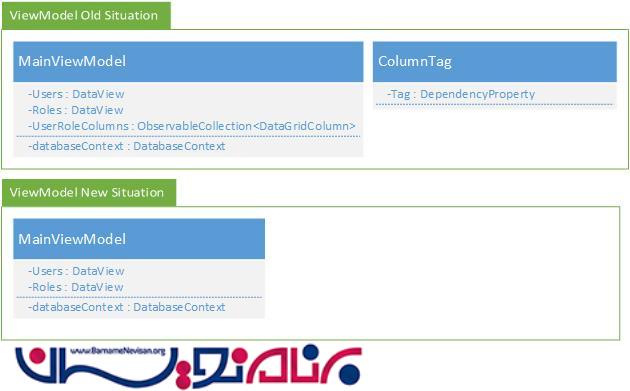 دیاگرام زیر وضعیت قبلی را نشان می دهد که View Model یک مجموعه قابل مشاهده شامل ستونهای datagrid دارد. مجموعه ستونهای datagrid در موقعیت جدید حذف خواهند شد و PresentationCore و PresentationFramework و System.Xaml و منابع WindowsBase حذف خواهند شد.
