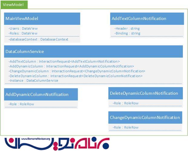 این کتابخانه توضیح می دهد که یک موقعیت مشابه در منطق ، در لایه View Model باید از لایه GUI جداسازی شود. در مقاله قبل توضیح داده شد که چگونه از باز کردن فایل و ذخیره Message box ها جلوگیری شود. در اینجا از همان مکانیزم برای مدیریت ستونهای داینامیک در datagrid استفاده میکنیم.