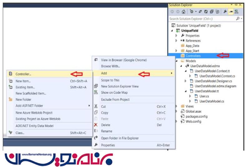 همان طور که از تصویر معلوم است روی Controller. راست کلیک کرده وAddرا میزنیم و Controller. از نوع Controller with views, using Entity Framework. MVC 5 از نوع News ایجاد میکنیم