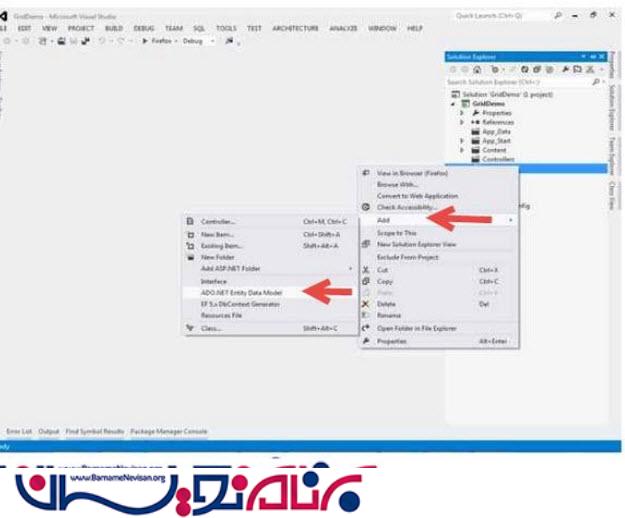 برای اضافه کردن Entity در قسمت Model راست کلیک کرده ودر قسمت Add>NewIitem>ADO.Net.Entity.Data.Model را انتخاب میکینم.
