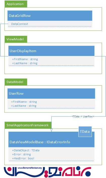 . SmallApplicationFramework و DataViewModelBase : کلاس پایه ای View model که شامل شیء داده هایی (نمونه ای از UserRow) که نمایش داده می شوند. این کلاس شامل منطق اعتبارسنجی می شود که خطاها را با استفاده از رابط IDateErroeInfo اطلاع می دهد.