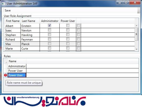 در مثال ما هر دو کنترل ها دارای اعتبارسنجی هستند. کنترل grid کاربران ، نام و نام خانوادگی را نیاز دارد. و در کنترل نقش ها ، نام نقش باید داده شود. نام نقش باید منحصر بفرد باشد.