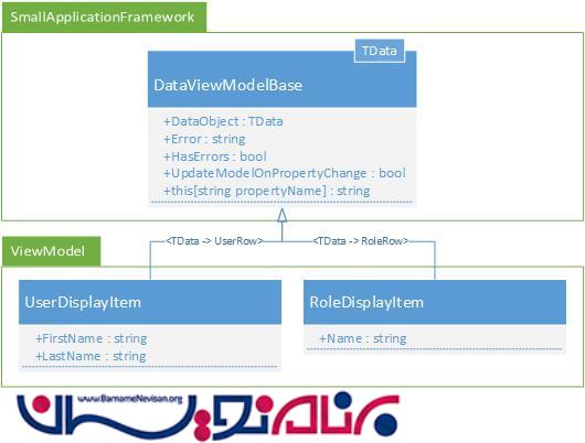 DataViewModelBase یک کلاس پایه ای است اگر چه بخشی از Small Application Framework می باشد. یک کلاس عمومی شامل نمونه مدل داده ای است. دیاگرام زیر نشان می دهد چگونه داده های UserRow و RoleRow بوسیله کلاسهای UserDisplayItem و RoleDisplayItem کپسوله سازی می شوند . نمونه داده بوسیله ویزگی DataObject قابل دسترس است.