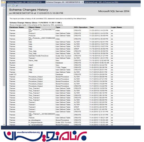 یک تب query جدید با وضعیت تمام دستورات DDL اجرا شده، نام پایگاه داده، تاریخچه(از زمان تاریخ و زمان)، Type، جزییات عملیات DDL با زمان به صورت زیر باز خواهد شد: