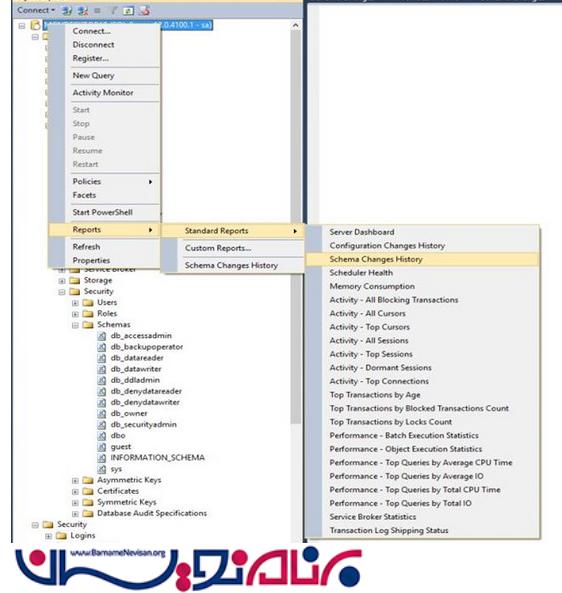 در مرحله اول، به Server Object Explorer خود رفته و بر روی سرور انتخاب شده راست کلیک کنید. حالا Reports را انتخاب کرده بعد آن Standard Reports، سپس بر روی گزینه Schema Change History کلیک کنید به صورت زیر: