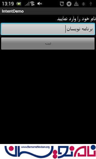 حالا برای رفتن به Layout دوم می توانید از یک Textview استفاده نمایید که با زدن نام خود و دکمه نام کاربر به intent دوم می رود و با یک پیغام textview نمایش می دهد.