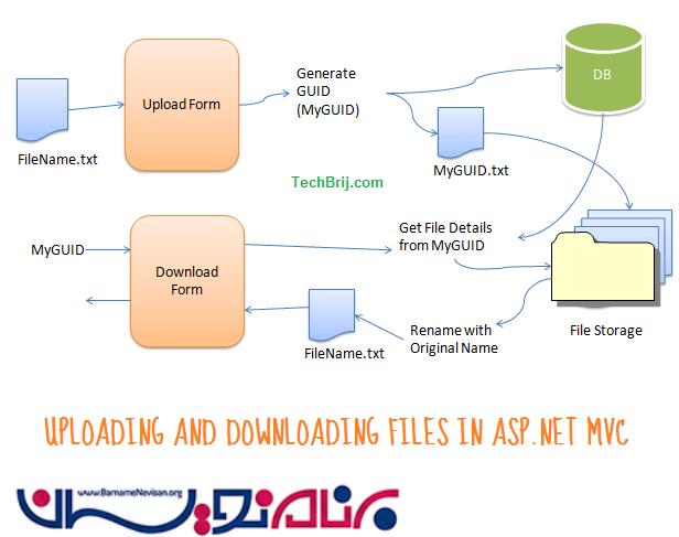 به صورت ساده وقتی کاربر فایلی را انتخاب می کند این فایل در داخل برنامه و در داخل app_data->Upload ذخیره می شود ولی در داخل بانک تنها نام این فایل که آپلود شده است را ذخیره می کنیم