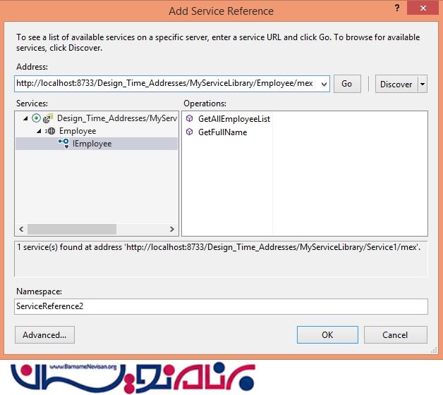 در تصویر بالا دو متد ایجاد شده در سرویس WCF قابل مشاهده است. با کلیک بر روی OK منابع سرویس WCFبه پنجره برنامه اضافه می شود. برای استفاده از آن به ایجاد یک نمونه از کاربر سرویس احتیاج داریم . تغییراتی در فرم به صورت زیر برای استفاده از سرویس ایجاد میکنیم.