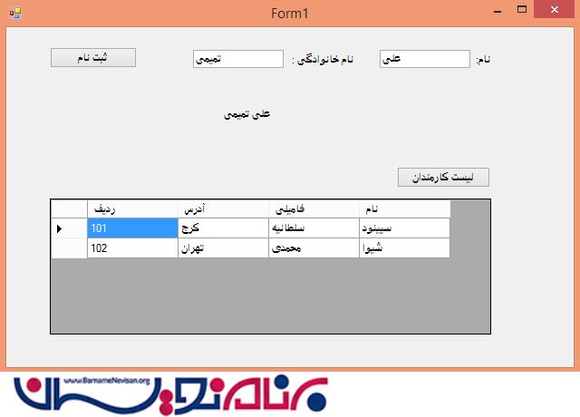 و زمانی که بر روی لیست کارمندان کلیک کنید ، نتیجه را به صورت زیر در DataGrid مشاهده خواهید کرد.