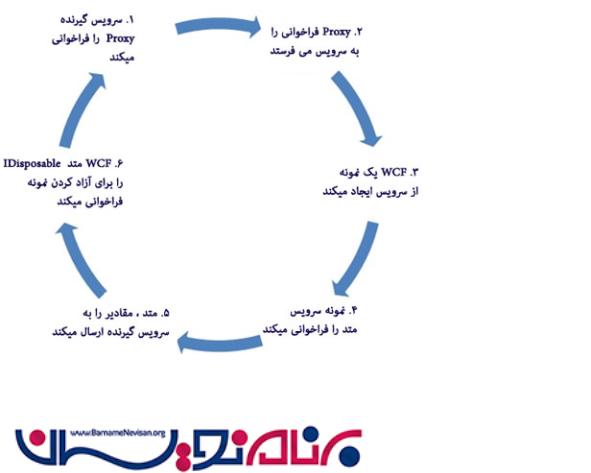 چه اتفاقی در هنگام درخواست تا بازگشتن داده ها به سرویس گیرنده می افتد؟ زمانی که یک سرویس را فراخوانی میکنید ، سرویس گیرنده به سراغ کلاسProxy می رود که قادر به کنترل داده های سرویس است یا برای ارتباط با سرویس استفاده می شود. پس این مسئولیت کلاس Proxy است که درخواست ها را به سرویس ارسال کند و از آن نمونه ایجاد کند. بعد از ایجاد نمونه از کلاس ، متد درخواست شده را فراخوانی میکند . متد مورد نظر ، مقدار را برمیگرداند و به سرویس گیرنده می دهد و بعد از آن نمونه ای از سرویس WCF نمایش داده می شود.