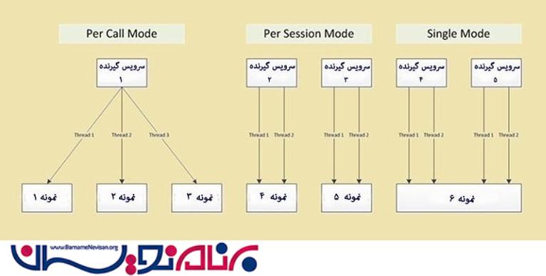 در این مقاله قصد داریم توضیحاتی درباره چگونگی ایجاد نمونه از سرویسهای WCF با راه های مختلف ارائه دهیم. درواقع در سرویسهای WCF سه راه برای ایجاد نمونه وجود دارد : Per Call ، Per Session و Single . برای درک بهتر به تصویر زیر توجه کنید.