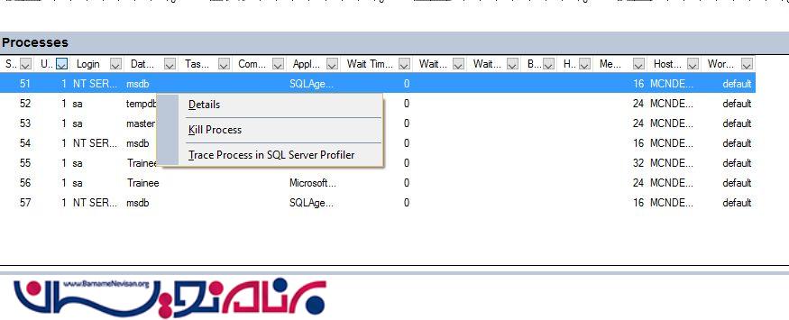 شما میتوانید فرایند ها را ویرایش نمایید: برای دیدن جزییات یا از بین بردن روند و یا ردیابی فرایند در sqlserver