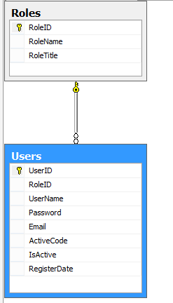 مدل در برنامه های MVC ظرف داده های ماست که در بین کنترلر و View پاس داده می شود .در نمونه ای که ضمیمه این مقاله می باشد قصد داریم تنها به ثبت نام کاربر با کمک View Model ها بپردازیم .در ابتدا یک دیتابیس ایجاد می کنیم که در آن تنها دو جدول user و Role وجود دارد .این دو جدول به همدیگر ارتباط دارند زیرا هر کاربری می تواند چندین نقش داشته باشد.