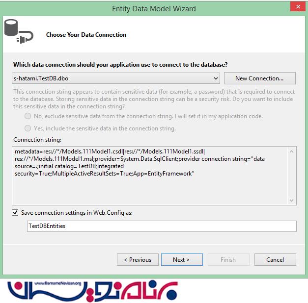 حال به افزودن این مدل با کمک Entity Framework DataBase First می پردازیم .برای افزودن این مدل به برنامه خود بر روی مدل کلیک راست و گزینه Add=>new Item=>ADO.net Entity Data Model را می زنیم .در پنجره ای که باز می شود روش Entity Framework DataBase First را انتخاب می کنیم .