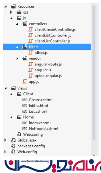 بخش مهم هر اپلیکیشن تک صفحه ای ساختار آن است. پروژه ما سه View دارد که شامل موارد زیر است:" لیستی از مشتریان"، "افزودن مشتری" و "ویرایش مشتری". این یعنی در واقع سه کنترلر AngularJS نیز برای این View ها داریم که شامل clientListController.js، clientCreateController.js و clientEditController.js می باشد. پوشه vendor شامل تمام کتابخانه های شخص ثالث(third-party) می باشد.
