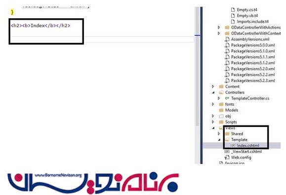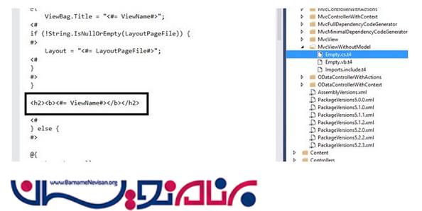 مرحله 4: تغییرات مورد نظر را در template های موجود در پروژه ایجاد کنید، برای مثال ما در اینجا MVCViewWithoutModel >> Empty.cs.t4 را تغییر داده ایم و به بخش header تگ <b></b> اضافه کرده ایم.