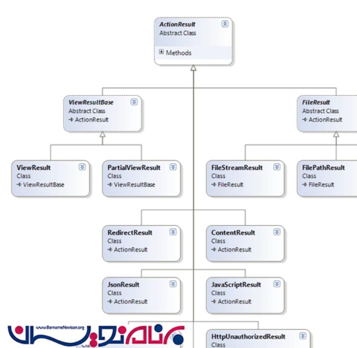 همان طور که گفته شد، ActionResult انواع مختلف خروجی ها را در برمی گیرد که برخی از مهمترین آنها در زیر لیست شده است :