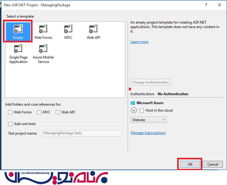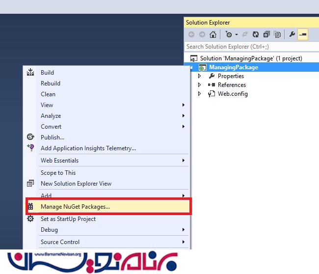 حالا ما یک پروژه ی جدید ایجاد می نماییم و روی پروژه ی خود راست کلیک کرده و گزینه ی Manage Nuget Package کلیک می نماییم.