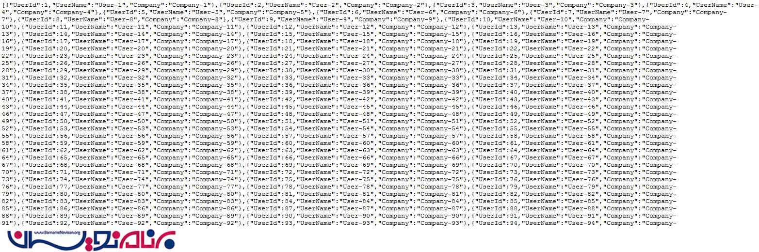 همان طور که می بینید در داخل این action متد GetUsers را فراخوانی کرده و حاصل را در یک لیست به نام Users قرار داده ایم .سپس در خط بعدی این لیست از اشیا را به صورت Json از َAction بازپس گرفته ایم