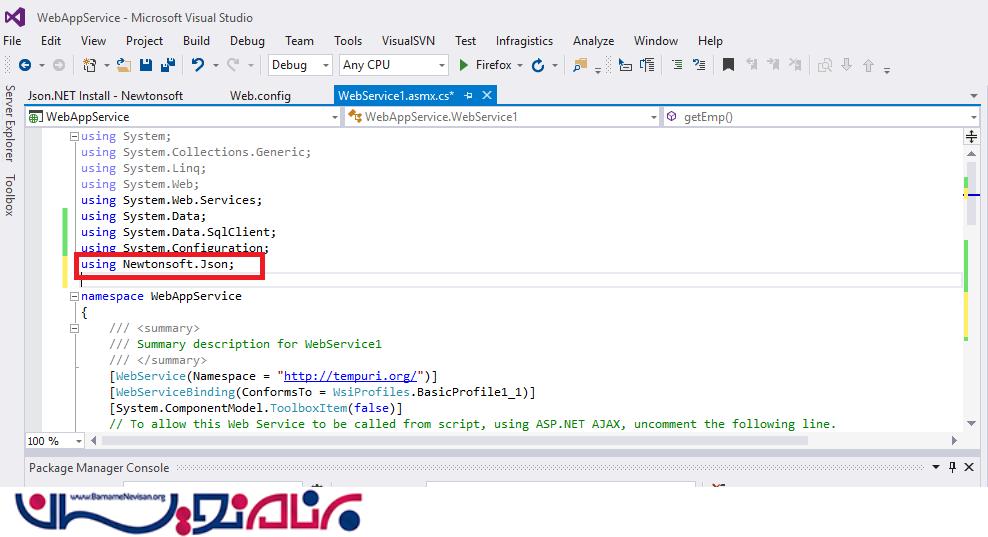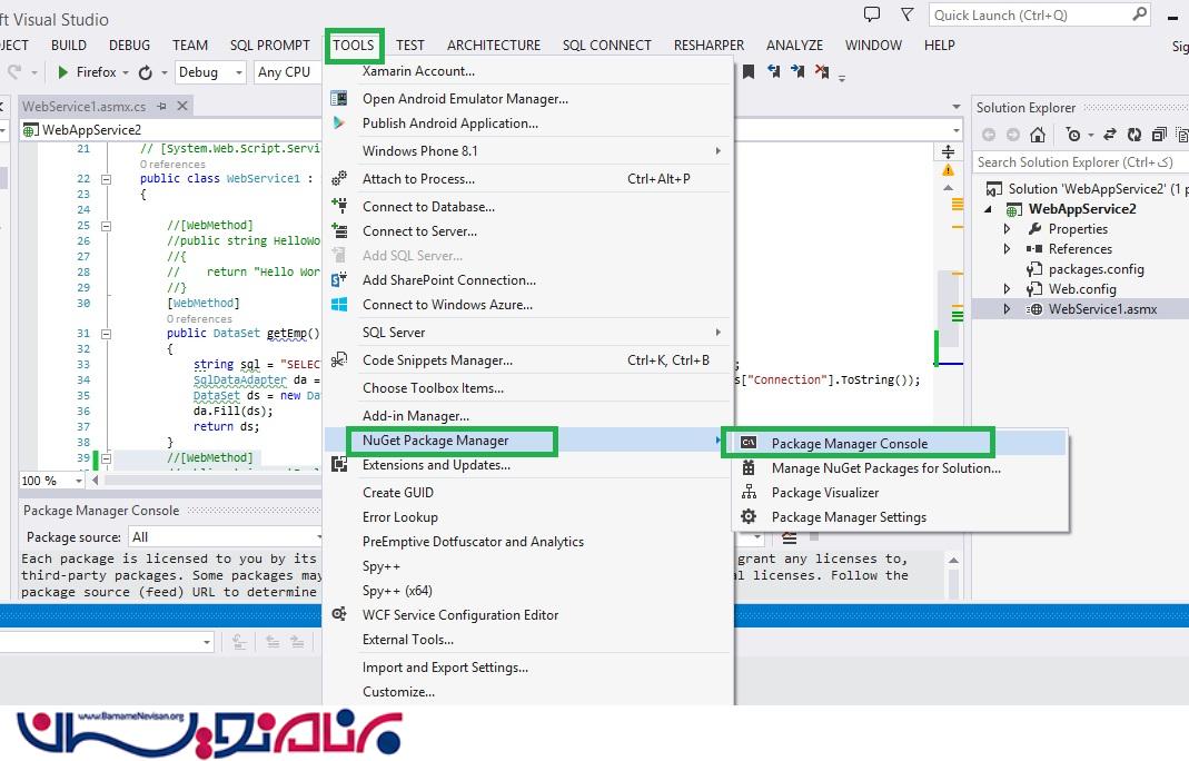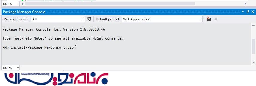 اکنون برای بازگرداندن داده ها به صورت JSON ، از Nuget Manager ، فایل newtonsoft.json را نصب کنید. برای این کار به Tools سپس NuGet Pakage Manager رفته و بر روی Pakage Manager console کلیک کنید.