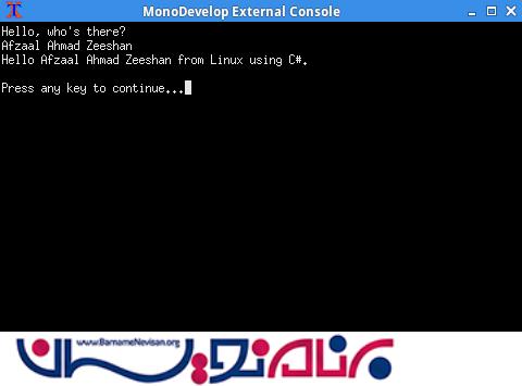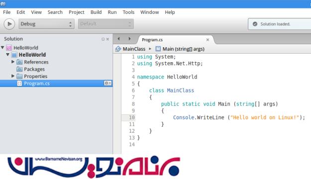 برای مثال در کد زیر برنامه ساده HelloWorld نشان داده شده است . می بینید که ساختار کدها در داخل IDE ویژوال و مونو با هم فرقی ندارد .