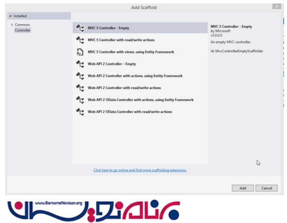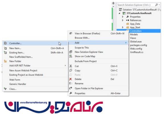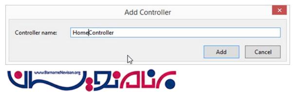 5. حالا یک کنترلر اضافه می کنیم. برای این کار بر روی Controllers راست کلیک کرده و Add->Controller را انتخاب کنید.