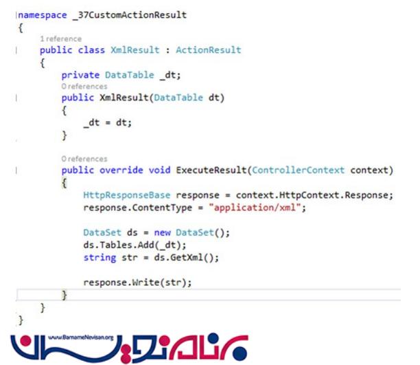 4. کلاس XMLResult از ActionResult ارث بری کرده و متد ExecuteResult را بازنویسی(Override) می کند.