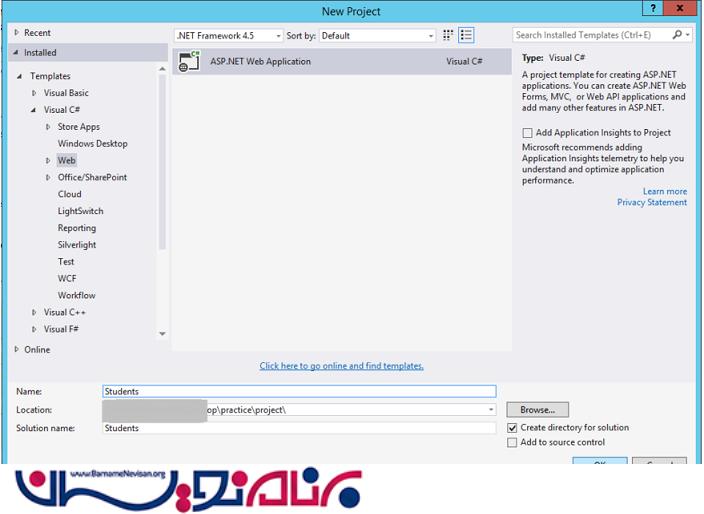 مرحله 1: یک ASP.NET Web Application جدید بسازید و نام آن را انتخاب کرده و کلید OK را بزنید: