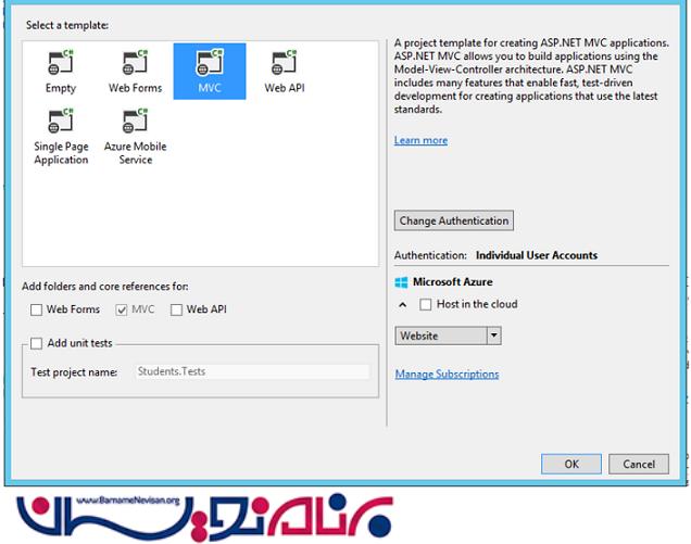 صفحه بعدی از شما می خواهد که template یا قالب پروژه مورد نظر را انتخاب کنید. لطفا Project Template را برای MVC انتخاب کرده و سپس OK را بزنید.