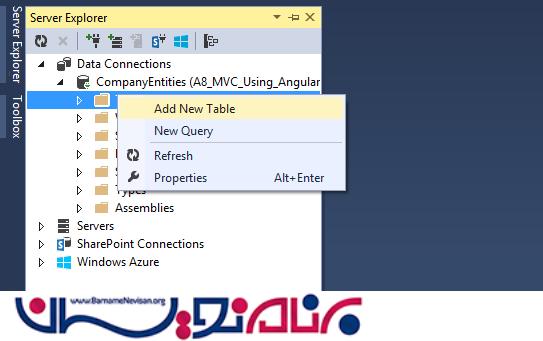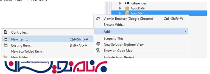 مرحله 2: در فولدر App_Start یک پایگاه داده محلی با نام Company ایجاد کنید سپس بر روی App_Start راست کلیک کرده و “Add -> New Item” را انتخاب کنید.