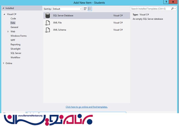 گزینه Data را از سمت چپ انتخاب و SQL Server Database را کلیک کنید و نام آن را Students.mdf قرار داده و دکمه Add را از صفحه زیر بزنید.