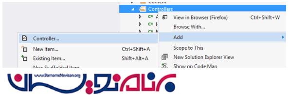 1. بر روی پوشه کنترلر راست کلیک کرده و با Add یک کنترلر اضافه می کنیم: