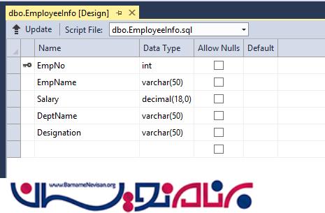 تا اینجا ما با موفقیت یک جدول EmployeeInfo با فیلدهای Id, EmpName, EmpNo, Salary, Designation, DeptName ایجاد کرده ایم.