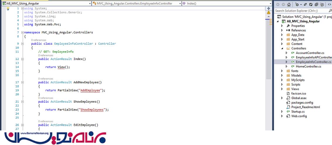 مرحله 12: حالا اجازه دهید EmployeeInfo view را در index action اضافه کرده و آن را به بوت استرپ متصل کنیم. ما از bootstrap designing در این نمونه برنامه استفاده کرده ایم.
