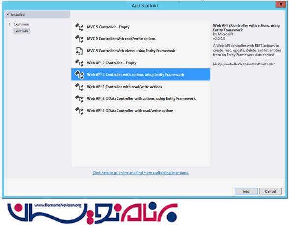 2. گزینه WEB API 2 Controller with actions, using Entity Framework را انتخاب کنید: