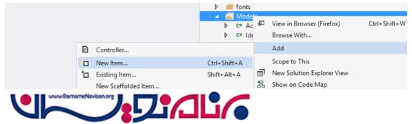 1. گزینه add new item را در پوشه Models انتخاب کرده و یک ADO.NET Entity Data Model به آن اضافه کنید.