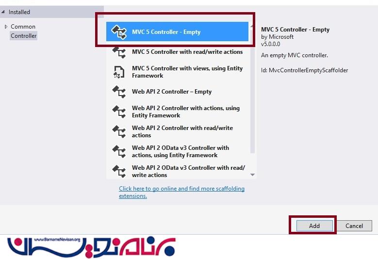برای افزودن کنترلر بر روی پوشه کنترلر کلیک راست کرده و گزینه Add->controller را می زنیم ، در صفحه باز شده نوع کنترلر خود را از نوع Empty در نظر بگیرید.