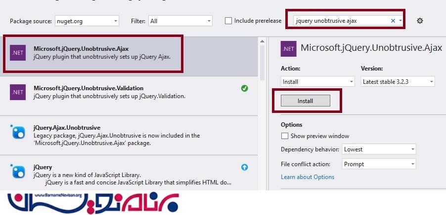 برای کارکرد درست Ajax.BeginForm نیاز داریم که کتابخانه jquery.unobtrusive-ajax را رفرنس دهیم .همان طور که میدانید روش های بسیاری برای افزودن کتابخانه های jquery به برنامه وجود دارد که یکی از این روش ها استفاده از Nuget است .وقتی از nuget استفاده می کنید به صورت خودکار به برنامه refrence میدهد و فایل های لازم را برنامه اضافه می کند .