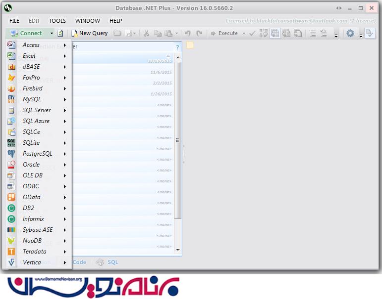 Database.NET یک مدیر پایگاه داده all-in-one می باشد که می تواند چندین پایگاه داده متعدد را به راحتی مدیریت کند. که هم با نسخه رایگان و هم با نسخه پرداختی ارائه می شود، نسخه مجاز(پرداختی) تقریبا 29 دلار می باشد. این ابزار به شخص اجازه می دهد که فقط با یک پایگاه داده عمده و مهم کار می کند و شامل پایگاه داده هایی می شود که ممکن است حتی برخی از آن ها را نشنیده باشید. همانطور که در لیست زیر می بینید، این فهرست بسیار گسترده است: