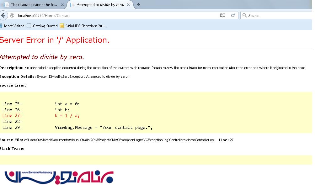 حال به صورت عمد در داخل کنترلر مربوط به Home و در داخل Action به نام contact یک کد اشتباه می نویسیم تا خطا تولید کند .کد کنترلر به صورت زیر است