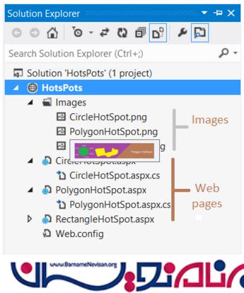 زیرا ما می خواهیم hotspot را روی تصاویر نشان داده شده ایجاد کنیم و ما باید تعدادی تصویر روی هرکدام داشته باشیم که hotspot ها روی آنها ایجاد خواهند شد.بنابراین در این مقاله سه تصویر داخل پوشه images قرار می دهیم. حالا Solution Explorer به صورت زیر خواهد شد:
