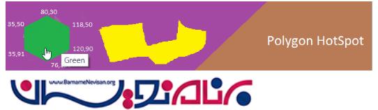 کد بالا را برای polygon hotspots نوشته ایم، در این کد دو PolygonHotSpots گرفته ایم که اولی برای دکمه سبز و دومی برای دکمه زرد می باشد.بنابراین اگر ما موس را روی ناحیه hotspot حرکت دهیم، نام ناحیه را روی tooltip نمایش می دهد.