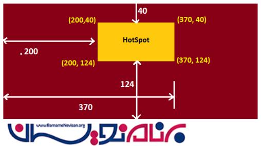 فرض کنید باید یک hotspot در یک ناحیه مستطیلی ایجاد کنیم، برای این کار باید چهار مختصات بالا، چایین، راست و چپ را بدانیم. تصویر زیر را ببینید که در آن یک hotspot ایجاد شده که در یک شکل مستطیلی ساخته ایم:
