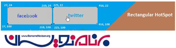 ما کد بالا را برای ایجاد hotspot های نقاط مستطیل شکل ایجاد می کنیم. در این کد دو RectangleHotSpots گرفته ایم که اولی برای facebook و دومی برای twitter می باشد، بنابراین اگر موس را روی ناحیه hotspot حرکت دهیم، نام ناحیه را روی tooltip نشان داده می شود.