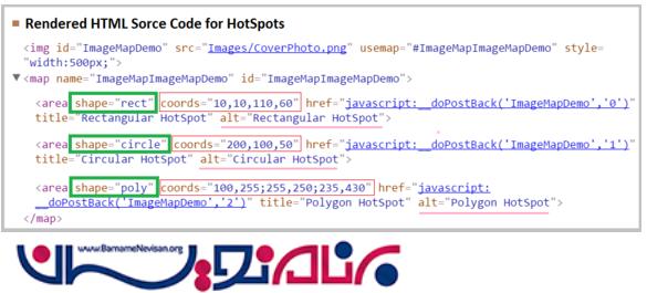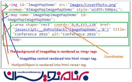 کنترل ImageMap یک انتزاع(abstraction ) سمت سرور را روی تگ های HTML با نام های <map> و <area> ارائه می دهد که یک image mapرا تعریف می کنند. این کنترل mageMap خود را به عنوان یک تگ <map> و ناحیه خود را به عنوان تگ <area> ارائه می دهد. اجازه دهید کد منبع را برای RectangleHotSpot مشاهده کنیم.