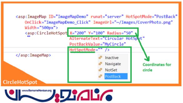 اگر ما نیاز داشته باشیم که یک نقطه اتصال دایره ای شکل تعریف کنیم می توانیم از CircleHotSpot استفاده کنیم که سه مقدار مختصات را به صورت مختصات X، مختصات Y و مقدار شعاع می پذیرد. اجازه دهید قطعه کد زیر را ببینیم که ما آن را داخل کنترل ImageMap استفاده کرده ایم.